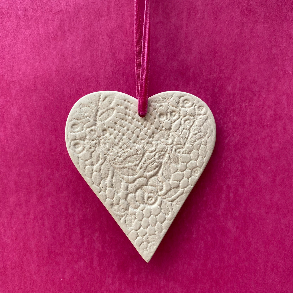 Handmade in our studio, each heart is made of white earthenware clay. The hearts are letter stamped, vintage lace embossed, bisque fired, glazed and fired again. The heart is then strung with your velvet ribbon of choice.